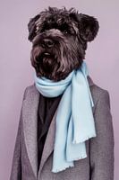 Een majestueuze Bouvier des Flandres presenteert zich met een opvallende, grove snuit en een zachtaardige blik die verborgen kennis van vervlogen tijden verraadt. Met een stijlvolle, lichtblauwe sjaal om zijn nek en een elegant pak ziet hij er zowel charmant als indrukwekkend uit, alsof hij het gezelschap van mensen op prijs stelt.
