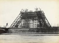 De Eiffeltoren is hier in aanbouw. Op de foto is het onderste deel van de toren al grotendeels voltooid, met een complexe constructie van metalen balken en steigers die de structuur ondersteunen. De bovenste…
