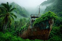 Het mysterieuze scheepswrak wordt onthuld te midden van weelderige, groene planten, zachtjes omarmd door de natuur. Met wolken bedekte bergen omlijsten het tafereel en geven het een mystiek aura. Dit kunstwerk brengt avontuur en reislust in elke woonkamer, een fascinerende gespreksstarter voor reizigers en dromers.