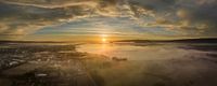 Luchtfoto van het in mist gehulde Radolfzell Aachried bij zonsopgang, met links de stad Radolfzell aan het Bodenmeer en aan de horizon het eiland Reichenau. Panoramafoto, samengesteld uit vier afzonderlijke beelden.