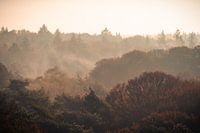 Deze foto is van enige hoogte gemaakt en je ziet hier enkel de toppen van de bomen van het bos. Door de gebruikte telelens worden de verschillende lagen van de foto mooi in beeld gebracht en ontstaat er een rustig beeld, zeker in combinatie met de mist die boven de bomen hangt en een prachtige, warme gloed van de zon krijgt.