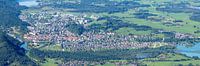 Achter Füssen glinstert de Weißensee, kalm en helder, en verder naar rechts de Hopfensee en de majestueuze Forggensee - hun wateroppervlakken weerspiegelen de lucht en wolken alsof ze het uitzicht tot in het oneindige willen uitbreiden. Bossen nestelen zich tegen de hellingen, velden gloeien in weelderig groen, en boven dit alles rust de stille grootsheid van de Beierse Alpen.