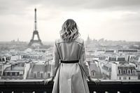 Een zwart-wit afbeelding van een elegante vrouw op een dakterras, peinzend starend naar de majestueuze Eiffeltoren in de verte. De vrouw straalt een aura van stijl en verfijning uit terwijl ze in haar eigen wereld lijkt te vertoeven. De iconische Eiffeltoren doemt op in de achtergrond, omringd door een licht vervaagd silhouet van de skyline van Parijs. De scène straalt een gevoel van eenzaamheid en contemplatie uit, gevangen in tijdloze elegantie en schoonheid.
