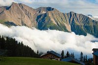 Een adembenemend tafereel vastgelegd in Riederalp, Zwitserland, waar alpine daken boven een dikke wolkenzee uitsteken.