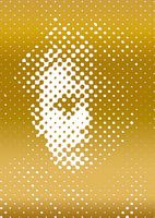 Van dichtbij zie je stippen, van een afstand komt het gezicht van een jongen tevoorschijn. In goud metaal.