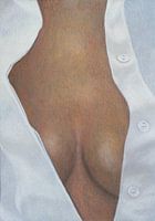 Hier heb ik een close-up van een vrouwenlichaam in zo'n 'boyfriend shirt' getekend, op een manier dat het beeld bijna een grafische vorm wordt. Draai het beeld een slag naar rechts en het lijkt een collage van een landschap!