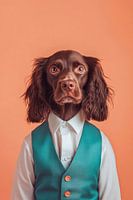 Deze Boykin Spaniel is gekleed in een chique vest en straalt een charmante elegantie uit. Met zijn fluweelzachte, chocoladebruine vacht en expressieve, grote ogen ziet hij er zowel speels als alert uit. Het contrast met de zachte, perzikkleurige achtergrond versterkt zijn fascinerende aanwezigheid en maakt hem de ideale weerspiegeling…