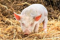 Prachtige opname van een schijnbaar boos jong biggetje in het stro in de kinderboerderij in Nederland