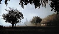 Brabants landschap in de vroege ochtend. Paard en koe in een mistige weide.