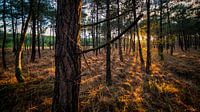 Opname in de Chaamse bossen in Brabant. Het is een tegenlichtopname met het goudgele zonlicht door de bomen.