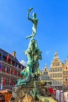 Prachtige opname van het Brabo monument (Brabofontein) op de Grote Markt in Antwerpen, Belgie , met een mooie zomerse blauwe lucht