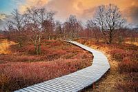 Knuppelpad door het hoogveen gebied op de Baraque Michel (Hoge Venen) tussen Eupen in België en de Duitse grens bij Mützenich.