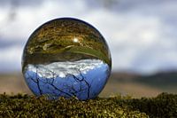 Weerspiegeling van boom in de lucht via een kristallen bol.