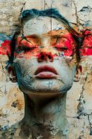 Deze foto toont het gezicht van een vrouw wiens ogen bedekt zijn door een rode streep die het midden van de foto domineert. De textuur van haar huid lijkt broos en vol barsten, alsof ze in een constante staat van verval en vernieuwing verkeert. Het dramatische contrast tussen de koude, ruwe textuur en de intense, heldere kleuren…