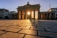 De Brandenburger Tor in de ochtend, de zon schijnt door de poort en hij is verlaten