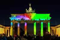De Brandenburger Tor met speciale verlichting (projectie van de Berlijnse skyline), ter gelegenheid van een lichtfestival in Berlijn.