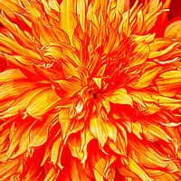 Digitaal bewerkte foto van een Dahlia. De originele afbeelding van deze prachtige bloem met prachtig gekleurde bladeren deed al zoveel denken aan een vuurzee dat de bewerking uiteindelijk volledig is doorgevoerd om het maximale effect te bereiken. De felle rood, oranje en gele kleuren zullen elke huiskamer een beetje warmte geven!