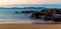 De branding bij zonsondergang, met op de voorgrond enkele rotsen waar het water als een melksluier langs spoelt.