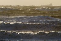 Brekende golven in de branding bij zonsondergang waarbij opspattend water wordt opgelicht met donkere dreigende lucht met aan de horizon een visserschip