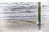 De Branding , golfslag gaat maar door een paar strandlopers rennen heen en weer op zoek naar voedsel. lopende langs het strand ervaar je de eindloosheid van de zee. de golven rollen achterelkaar aan alsof het een spel is. De strandpaal laat zien waar je bent langs de schijnbaar eindeloze kustlijn.