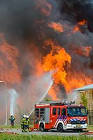 Brandweerauto bij een grote uitslaande brand op een industrieterrein. Bij deze brand op het industrie van Kampen werd een pallethandel volledig verwoest.