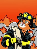 De afbeelding is een cartoonillustratie van een dappere kat verkleed als brandweerman. De kat draagt een gele helm met een pootafdruk erop, een zwarte jas met gele strepen en een witte handdoek over zijn schouder. Hij heeft een vastberaden uitdrukking op zijn gezicht en staat voor een razende brand. De achtergrond is oranje met vlammen…