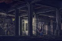 Het flitslicht werpt scherpe contrasten en speelse schaduwen over de scène, waardoor de bewegingen van de danser extra worden benadrukt. Elke sprong, draai en beweging lijkt vastgelegd in een moment van pure expressie, waarbij de danser de grenzen van ruimte en tijd overstijgt. De foto ademt een sfeer van beweging, vrijheid en zelfexpressie, waarbij de rauwe schoonheid van de urbexlocatie perfect samengaat met de gracieuze kracht van de breakdance.