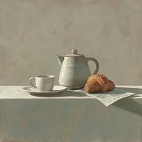 Breakfast Serenity - Dit stilleven schilderij toont een rustig ontbijttafereel met een keramieken theepot, een bijpassende kop en schotel op een schotel, en een goudbruine croissant op een stuk krant, alles badend in zacht natuurlijk licht.