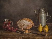 En stilleven in de stijl van de oude meesters met rustiek zuurdesembrood, rode druiven, peren, een tinnen beker, een tinnen schaaltje met walnoten, een oud mes en een antieke tinnen koffiekan uit de 19e eeuw op een houten tafel
