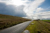 Nr Llandeusant Brecon Beacons Wales UK A mountain road leads into the distance with rainclouds clearing to reveal sun.