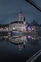 Avondfoto van de haven van Breda, met de Grote Kerk vanuit het Spanjaardsgat. Spiegeling in het water. Deels kader van het hekwerk.