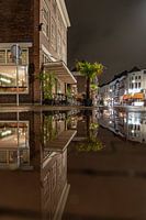 Nachtfoto van pand De Trapkes, De Botanist. Zicht op de Tolbrug en Haagdijk. Spiegeling in regenplas.