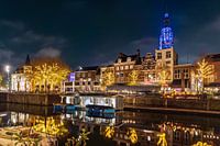 Breda in kerststemming. De feestverlichting licht op langs de Haven en weerspiegelt in het water van de Nieuwe Mark. De toren van de Onze Lieve Vrouwekerk is blauw aangelicht....