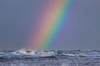 Een brede regenboog boven de Noordzee. Strand Noordwijk.
