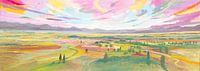 Kleurrijke vlekken bedekken het land terwijl de bomen zich presenteren in gebruikelijke groentinten. De brutaliteit van deze kleuren brengt een voelbare levendigheid over en toont de energie die het kunstwerk losmaakt. De lichtstralen die door de wolken breken creëren een spannend effect dat de scène nog indrukwekkender maakt.