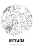 Zwart-witte landkaart, stratenplan of plattegrond van Bredevoort. Bredevoort is gelegen in de Achterhoek, in de gemeente Aalten, provincie Gelderland. Op de stadskaart zijn alle openbare wegen in Bredevoort opgenomen. Verder is de kaart voorzien van de coördinaten van het centrum van Bredevoort.