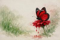 Dit aquarelschilderij toont een levendige, rode vlinder die op een donkerrode bloem zit, tegen een zacht, waterig ogende achtergrond. De stijl is los en impressionistisch. De compositie benadrukt de schoonheid en het contrast van de rode en zwarte vlinder. De bloem lijkt te 'bloeden', met rode druppels die eraf vallen en zich…