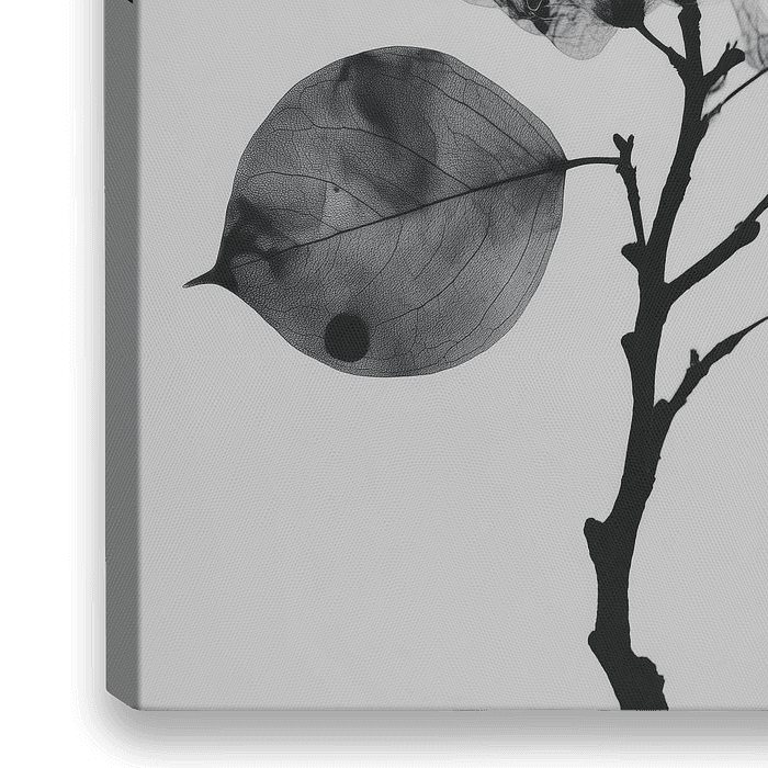 Botanisch kunstwerk met delicate, doorschijnende bladeren in monochrome tinten. Het beeld legt de ingewikkelde aderstructuur en organische imperfecties vast, waardoor minimalisme en natuurlijke elegantie samenvloeien in een poëtische compositie.