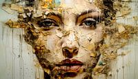 De foto toont een fascinerend portret waarin een menselijke figuur lijkt te zijn opgebouwd uit gefragmenteerde lagen en gebroken materialen. De huid van de vrouw is bedekt met gestructureerde, broze fragmenten, waardoor het lijkt alsof ze gevormd is uit een soort uiteenvallend behang of mozaïek. Haar ogen springen eruit in een intens blauwe kleur, een duidelijk contrast met de aardetinten van de rest van de compositie. De gelaatstrekken zijn tegelijkertijd precies en fragiel, alsof ze zijn samengesteld uit verschillende lagen uit het verleden.