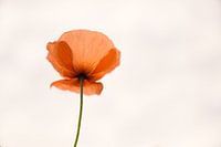 Beeld van een enkele klaproos tegen een bijna witte achtergrond. Vanuit laag perspectief genomen, waardoor de fragiele bloemblaadjes mooi uitgelicht worden.
