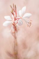 Mooie macrofoto van een kleine witte fragiele bloem. De stamper en meeldraden zijn tot in detail zichtbaar. De achtergrond is wazig en zachtroze. Een zomerse zachte romantische en dromerige foto met pastelkleuren.