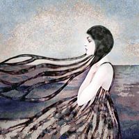 Portret van een vrouw met lang haar in de wind aan zee. Abstract schilderij in Gustav Klimt stijl. Fantasie mixed media in voornamelijk blauw,bruin en paarse tinten