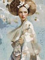 Zomers portret van een vrouw met hoed en bloemen in zachte pastel kleuren met grijs,lichtblauw,beige en bruin tinten.