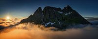 Breidtinden summit over cloudy Mefjorden in sunset light, Senja, Norway
