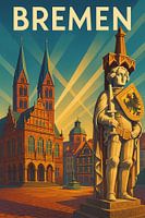 Deze Bremer reisposter in Art Deco stijl laat het iconische Rolandstandbeeld zien dat trots voor het historische stadhuis staat. De gedurfde architecturale lijnen en het warme gouden licht creëren een sfeer van trots en traditie en laten een van de belangrijkste Duitse UNESCO werelderfgoederen zien. Met gedetailleerde afbeeldingen van gotische en renaissance-architectuur straalt het ontwerp elegantie en tijdloze charme uit. De balken op de achtergrond verlichten het middeleeuwse plein en benadrukken de rijke geschiedenis van Bremen als Hanzestad. Deze vintage print is perfect als muurkunst en combineert klassieke Europese cultuur met stijlvolle retro-esthetiek. Het is een uitstekende aanvulling voor elk huis, kantoor of galeriemuur, vooral voor bewonderaars van de Duitse geschiedenis, stedentrips en Art Deco design. Of je Bremen nu hebt bezocht of gewoon van architectonische kunst houdt, dit stuk vangt de essentie van de stad op een manier die zowel nostalgisch als modern aanvoelt.