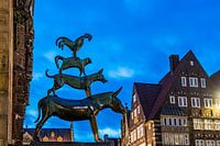 Beeldhouwwerk van de Bremer Stadsmuzikanten bij schemering, Vrije Hanzestad Bremen, Duitsland, Europa | Beeldhouwwerk Stadsmuzikanten van Bremen bij schemering, Vrije Hanzestad Bremen, Duitsland, Europa