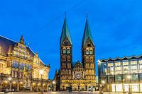 Marktplein van Bremen met stadhuis, kathedraal en parlementsgebouw bij schemering, Vrije Hanzestad Bremen, Duitsland, Europa | Het marktplein van Bremen met stadhuis, kathedraal en parlementsgebouw bij schemering, Vrije Hanzestad Bremen, Duitsland, Europa
