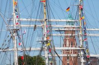 Nieuwe haven met masten van het zeilschip Staatsraad Lehmkuhl en Simon-Loschen-Leuchttrm tijdens Sail 2015, Bremerhaven, Bremen, Duitsland