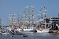 Nieuwe haven met zeilschepen tijdens Sail 2015, Bremerhaven, Bremen, Duitsland, Europa I Nieuwe haven met zeilschepen, versierd met vlaggen, Festival Sail 2015, Bremerhaven, Bremen, Duitsland, Europa