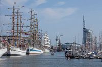 Nieuwe haven met zeilschepen en Havenwelten en Atlantic Sail City Hote tijdens Sail 2015, Bremerhaven, Bremen, Duitsland